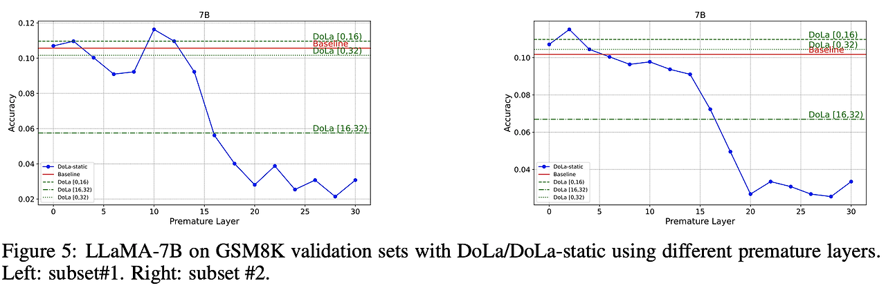비교적 초기 Layer와 Contrast시에 DoLa-static이 GSM8k에서 더 높은 성능을 보였다.