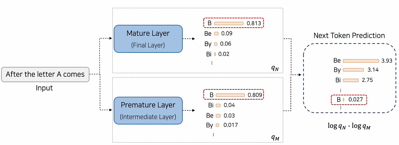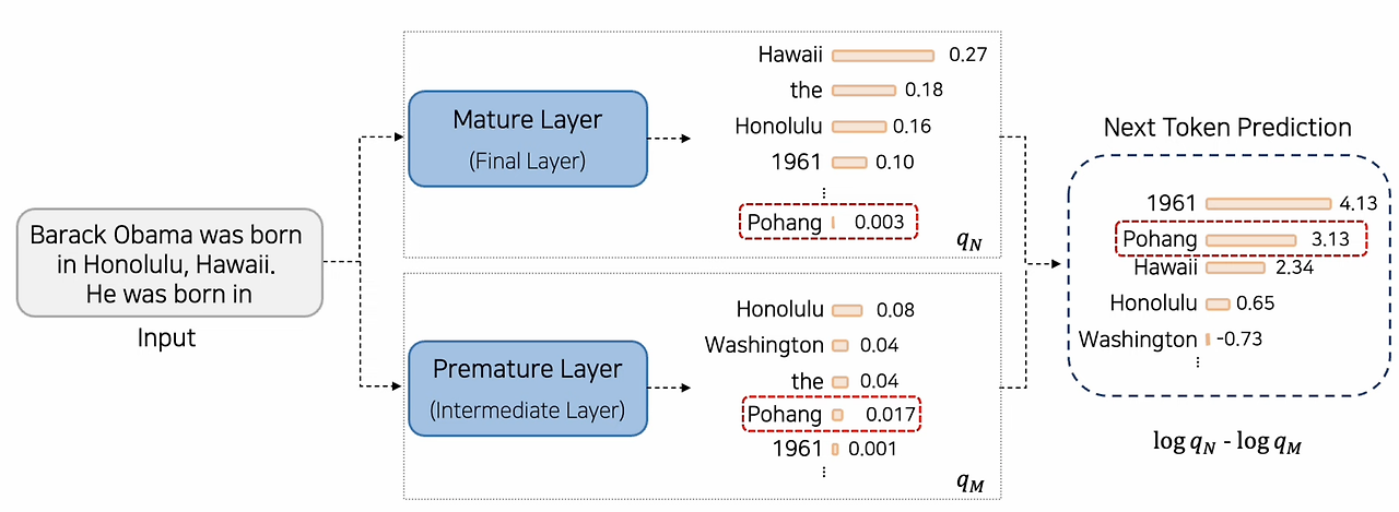 Next Token Probability 산출 시 후반 Layer와 초반 Layer의 정보를 Contrast함