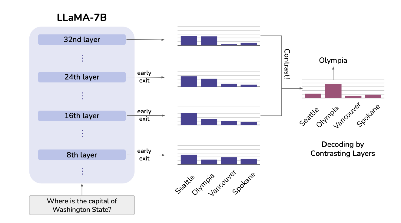 그림에 나와있는 것처럼 early exit를 하여 중간 Layer에서의 token distribution을 구하고 마지막 Layer를 제외한 나머지 Layer 중 특정 Layer와 마지막 Layer간의 Contrasting을 통해 수정된 vocab distribution을 얻은 다음 특정 Decoding 방식을 사용해 Token을 생성하는 방법론이라고 생각하면 될 것 같다.