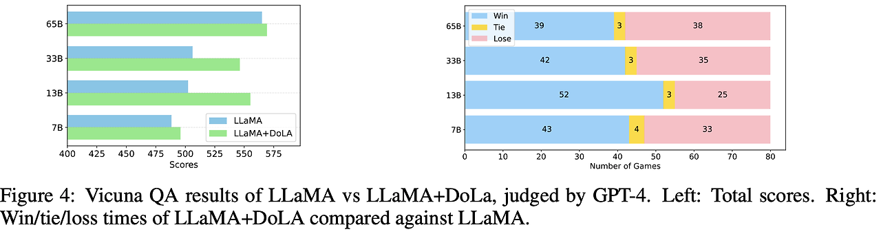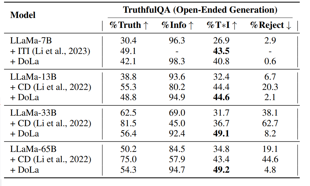 Chatbot 에서도 DoLa가 효과적임을 보았고, 특히 13B, 33B에서 Baseline보다 크게 높은 성능을 보였다.