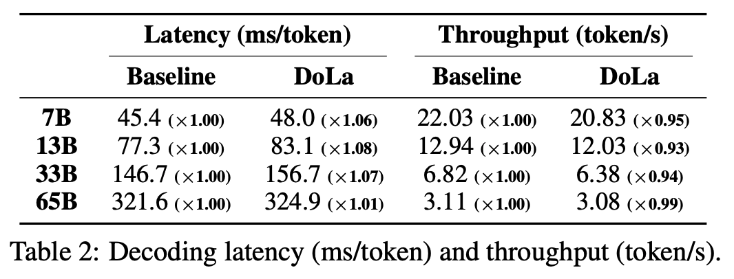 DoLa: Decoding step마다 Contrast대상 Premature layer를 선택을 위한 연산 수행 <-> DoLa-static: validation performance를 기준으로 단 하나의 premature layer 선택 후 고정