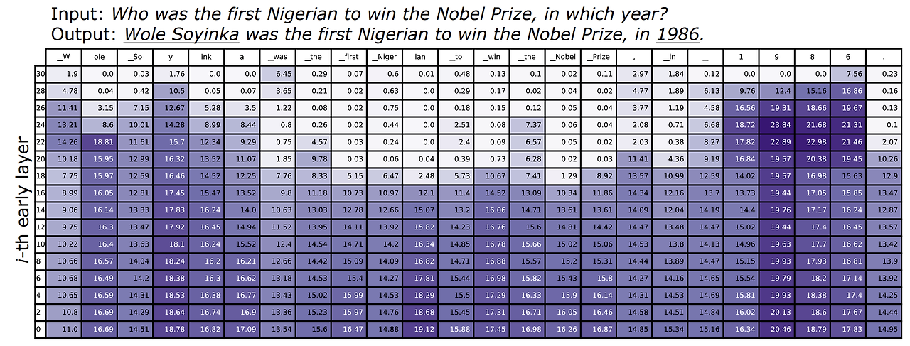 기능어 또는 Input에서 복사해온 토큰 ("first Nigerian', "Nobel Prize")을 예측할 경우, 중반 Layer에서 JSD가 매우 작다. -> Model이 어떤 Token을 생성할지 미리 결정한 것으로 보임.