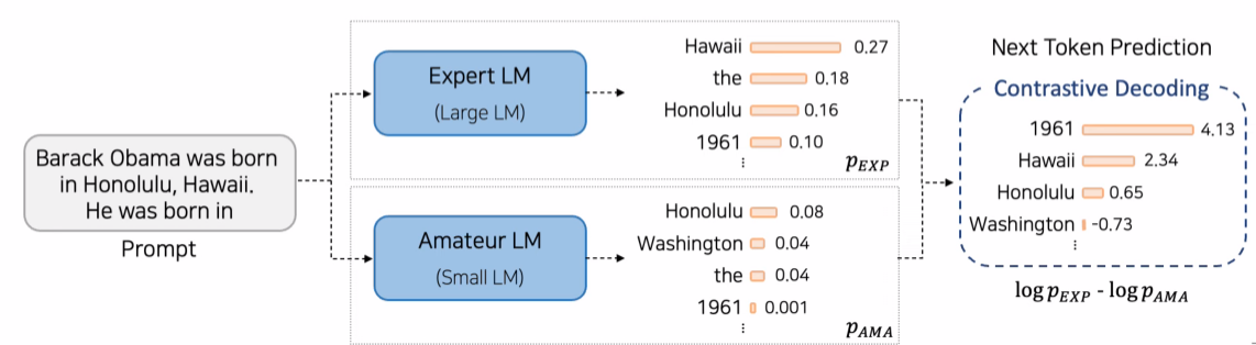 Large LM과 Small LM의 Token probability의 차이를 이용해서 Decoding하는 방법