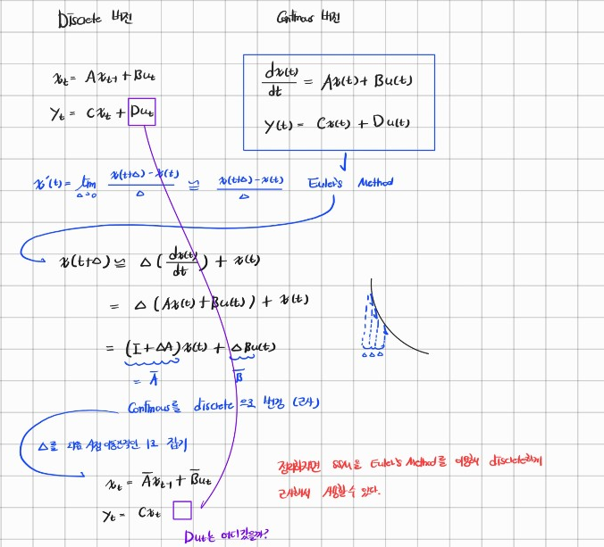 State Space Model(상태 공간 모델)은 시스템의 상태를 연속적인 시간에 따라 변화하는 방식으로 설명합니다. 하지만 실제로는 대부분의 컴퓨터나 디지털 제어 시스템은 연속적인 시간을 직접 처리할 수 없기 때문에, 이 모델을 이산화(Discretization) 과정으로 변환할 필요가 있습니다. 이산화는 연속적인 시간 축에서 발생하는 변화를 이산적인 시간 간격으로 나누어 분석하고 계산하는 과정입니다.