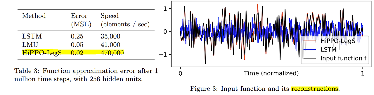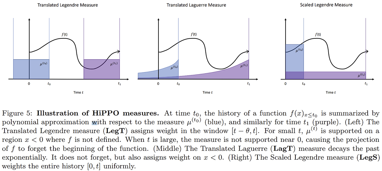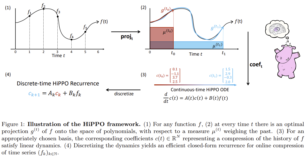장기 기억모델 HiPPO: 기존 RNN, GRU, LSTM등의 시계열 모델 연구의 핵심은 explicit한 기억과 망각이다. 기억과 망각회로를 직접 집어넣어 모델이 특정 부분을 얼마나 기억할지, 잊어버릴지를 결정하도록 한다. 한편 다항함수는 계수 N개만으로 함수 전체를 복원할 수 있다. 따라서 유한개의 스칼라로 거의 완벽한 암기를 할 수 있는 것이다. 기억을 관장하는 부분을 HiPPO로 바꿔 끼움으로서 시간거리가 먼 곳도 참조할 수 있게된다.