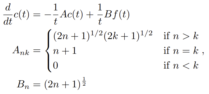 HiPPO는 시간에 따른 의 중요도인 를 설정하면 그에 따른 최적의 다항함수 계수인 를 효율적으로 구하고, 의 시간에 따른 변화량을 이산적으로 표현할 수 있는 선형변환의 행렬 를 구하는 방법이다.