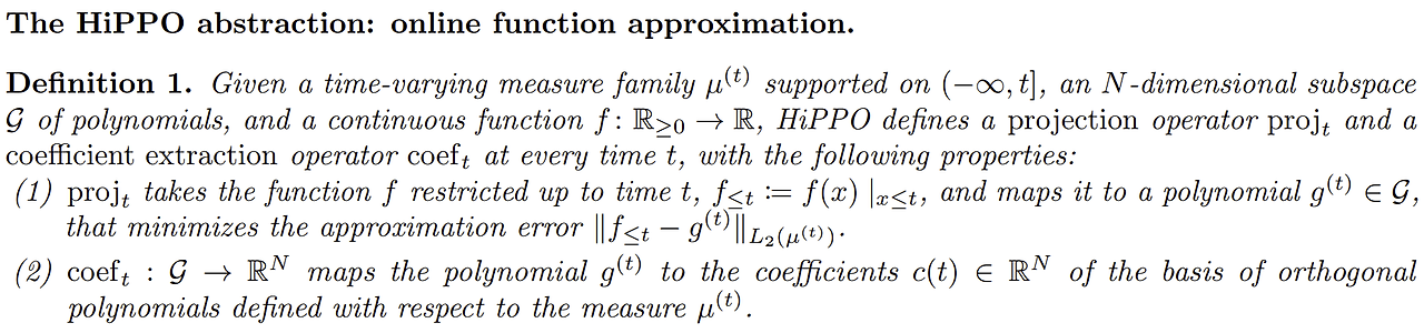 와 같이 표현할 수 있다. 따라서 Hippo는 임의의 함수 를 고차 다항함수(High-order Polynomial)로 재표현(projection)하는 연산자(Operators)를 말한다.
