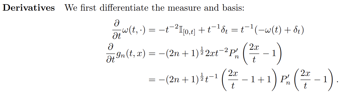 Appendix C는 로 부터 를 얻는 과정을 general하게 설명하고, D는 scaled and shifted 르장드르 다항함수 기저와 measure를 대입해서 직접 계산한다. D에서는 LegS말고도 여러 basis-measure 세트에서 계산을 했지만 나는 LegS만 살펴봤다.