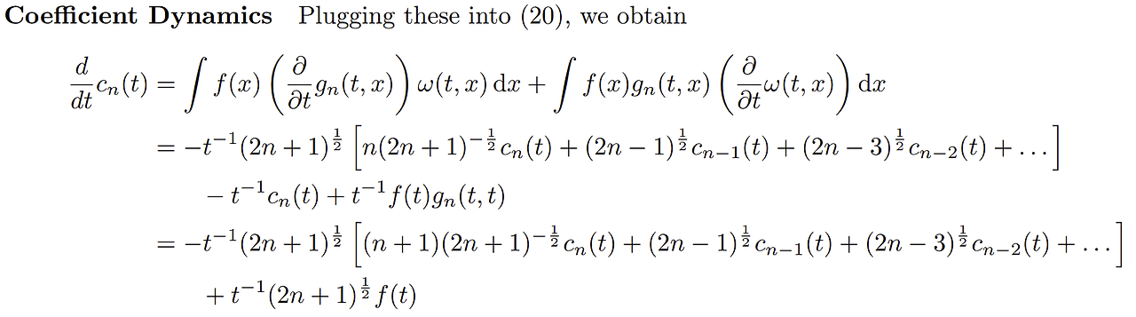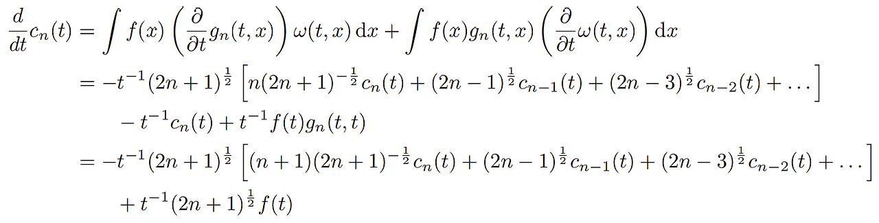함수간 내적은 적분으로 정의가 된다. 의 정의를 미분하면 좌변은 우리가 원하는 항이 되고 우변은 계산을 좀 더 하면 $cn(t), c{n-1}(t), ...으로 표현할 수 있다. 이 부분은 계산이 복잡해서 appendix에서 확인할 수 있다.