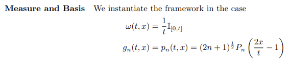 시간에 따른 중요도인 measure 가 주어졌을 때 은 에 대해 orthogonal한 다항함수 기저로 정의한다.