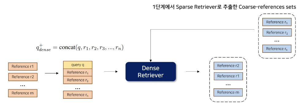 - 1단계에서 Sparse Retriever로 추출한 Coarse-references sets과 Query q와 Reference를 Concat한 것을 Dense Retriever에 넣어서 Reranking을 해줌
