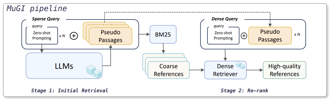 | MuGI | 0 (Zero-shot) * N번 | 5 (Sparse), 3 (Dense) | Sparse + Dense | Sparse (Adaptive Repetition Ratio) Dense (단순 concat) |