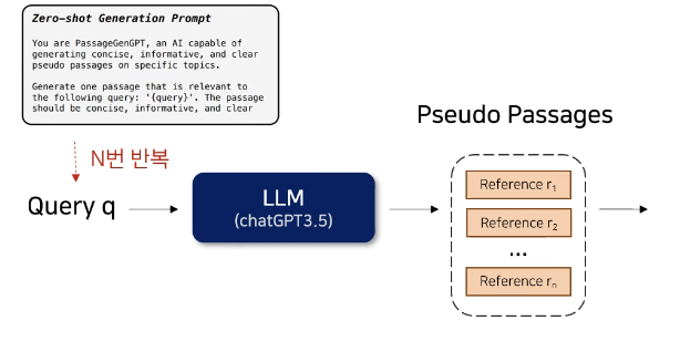 1. LLM에게 Zero-shot prompt를 주어서 Query와 관련된 Pseudo Passage를 생성함
