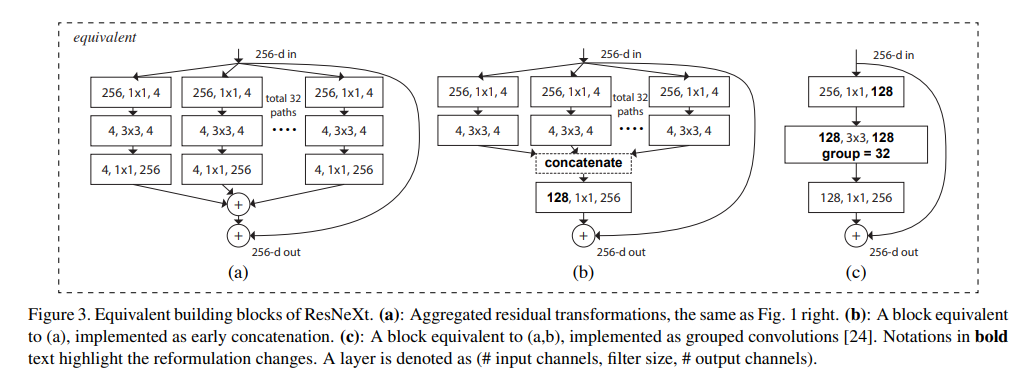 inception module은 input을 저차원의 embedding으로 split하고 서로 다른 filter가 있는 path들을 거쳐 concatination을 통해 merge한다. 이와 달리 ResNeXt는 각 path에 대해 동일한 layer구성을 가진다. 이를 grouped convolution이라고 한다.