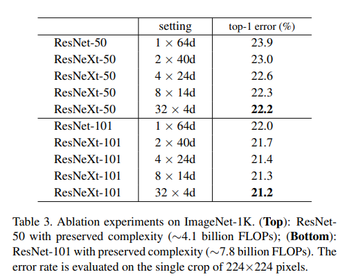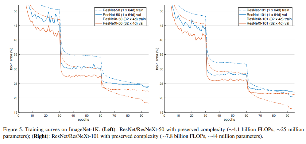위의 그래프는 ResNet과 ResNext의 동일한 깊이별성능 비교이며 ResNext가 성능이 더 좋은 것을 알 수 있다.