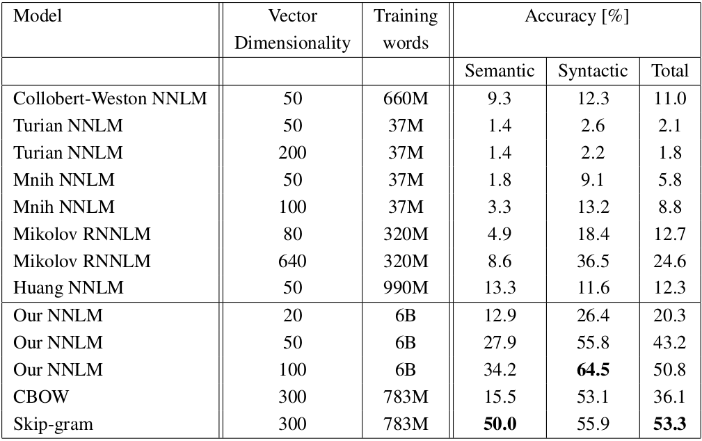 의미적 정보에서 Skip-Gram이 월등히 앞서면서 문법적 정보에선 아주 조금 밀리는 모습을 보입니다.