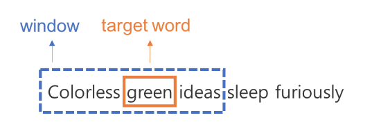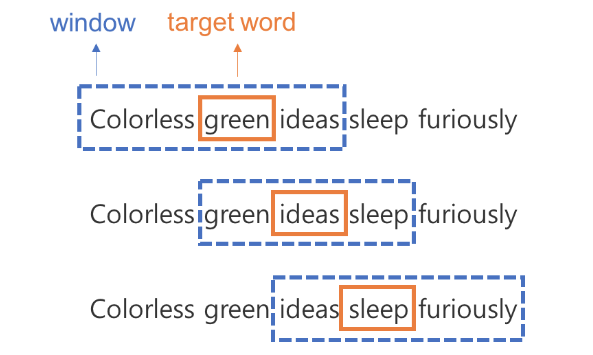 총 6개의 토큰(Colorless, green, ideas, sleep, furiously)으로 이루어진 문장입니다. 이때 기준이 되는 단어를 중심단어, 중심단어와 동시에 등장하는 단어를 주변단어라고 정의합니다.