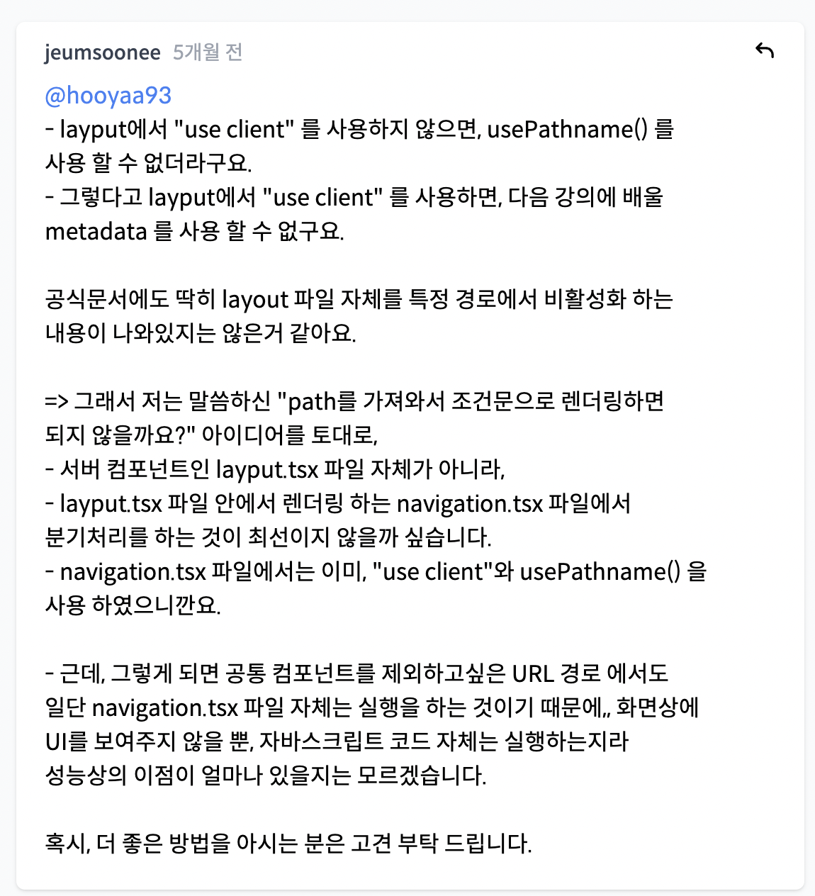 url을 조건부 처리해서 레이아웃이 보이지 않게 해야하는데 layout.tsx에서는 use client를 사용하지 못하니까(SSR에서만 가능한 metadata 때문) 레이아웃의 ui가 실제 적용된 components/navigation.tsx 파일에서 조건부 처리를 해주는 것이 좋겠다는 의견이다