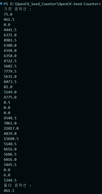 값이 1로 나왔습니다. 이는 윤곽선의 크기를 제대로 고려하지 않고 임의로 크기를 지정하여 발생한 것으로 기존 윤곽선과 필터 윤곽선의 넓이를 각각 출력하여 확인해 보겠습니다.