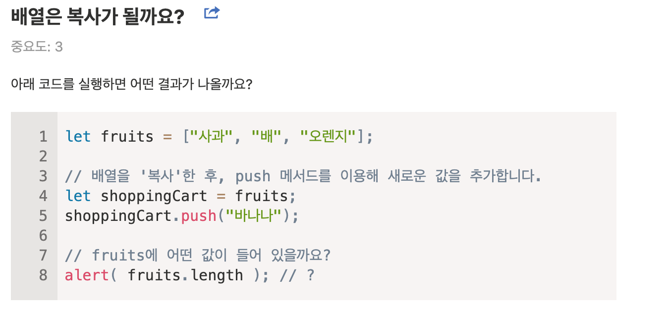 그러므로 fruits와 shoppingCart는 같은 객체를 가르키고 있다.