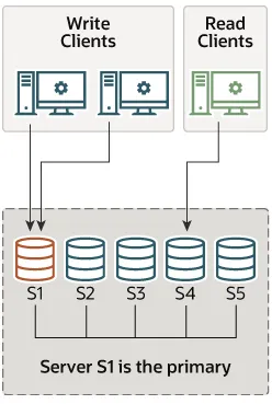 InnoDB 클러스터에서 MySQL 서버들은 그룹 복제 형태로 복제가 구성 되며, 각 노드는 Primary 혹은 Secondary 중 하나로 동작하게 된다. 여기서 읽기/쓰기가 모두 가능한 서버가 Primary이다.