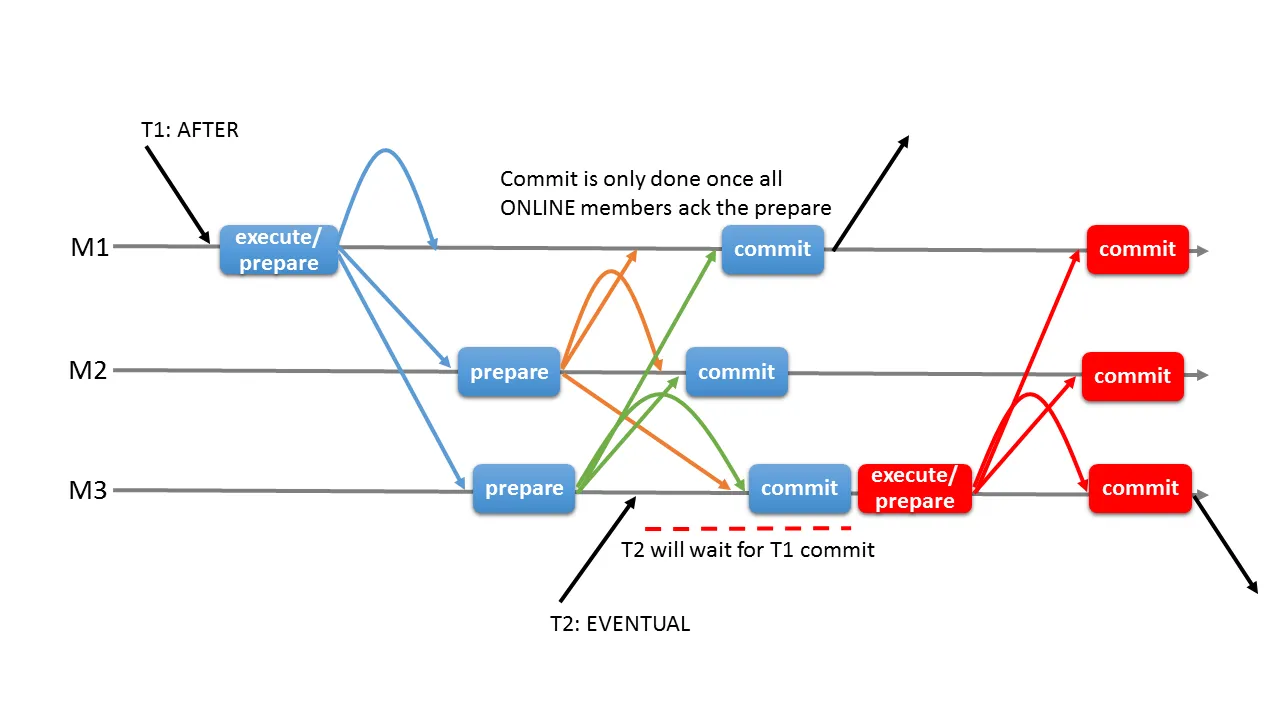 AFTER 일관성 수준은 트랜잭션 커밋 후, 자신의 변경사항이 그룹 내 다른 멤버에 적용되었는지 확인하는 일관성 수준이다. 읽기-쓰기 트랜잭션은 다른 모든 멤버들에서도 커밋될 준비가 됐을 때까지 기다린 후 최종 처리 되며, 읽기 전용 트랜잭션은 변경사항이 없으므로 제약 없이 처리된다. 아래 그림처럼, 그룹의 다른 멤버로 부터 Prepare응답을 받으면 Member 1에서 최종적으로 커밋이 수행된다.