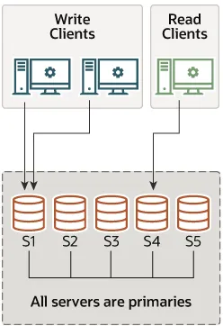 기존 복제의 경우에는 일반적으로 소스-레플리카 구조로 단방향 복제가 이루어지지만, 그룹 복제에서는 복제에 참여하는 서버들이 하나의 복제 그룹으로 묶인 클러스터 형태 및 서로 통신하며 양방향으로 복제를 처리할 수도 있다. 즉, 하나의 복제 그룹에서 쓰기 처리 서버가 여러 대 존재할 수 있는 것이다.