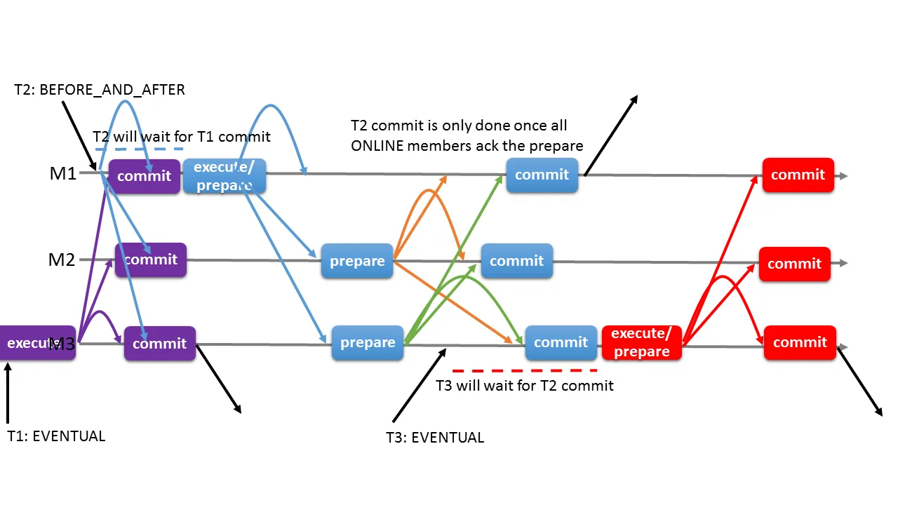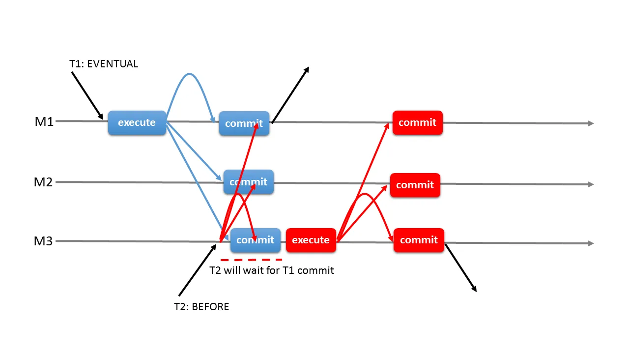 BEFORE 일관성 수준은 트랜잭션 시작 전에 그룹의 선행 트랜잭션이 모두 완료되었는지 확인하는 일관성 수준이다. 아래 그림 처럼 Member 3에서 T1 트랜잭션이 적용되고 나서 T2 트랜잭션이 수행된다.