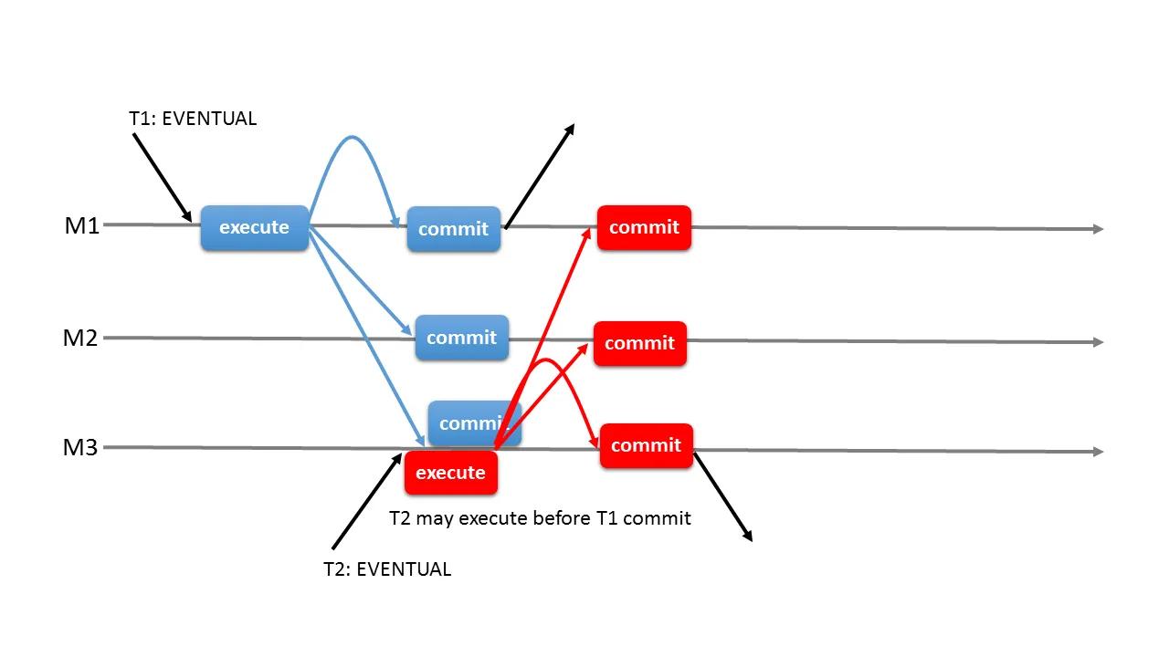 아래 그림과 같은 상황에서 T2 트랜잭션이 T1이 완전히 Member 3에 적용되기 전에 실행 되었으므로, 최신 데이터가 아닐 수도 있고 T1과 충돌할 수도 있다.
