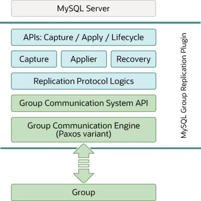 그룹 복제는 별도 플러그인으로 구현되어 있으며, 이를 사용하기 위해서는 각 MySQL 서버에 그룹 복제 플러그인이 설치되어 있어야 한다. 이 플러그인은 내부적으로는 여러 계층의 아키텍처로 구성되어 있다. 이 아키텍처는 트랜잭션의 실행부터 복제, 충돌 감지, 합의까지 다양한 컴포넌트가 유기적으로 동작하는 구조로 되어 있다.