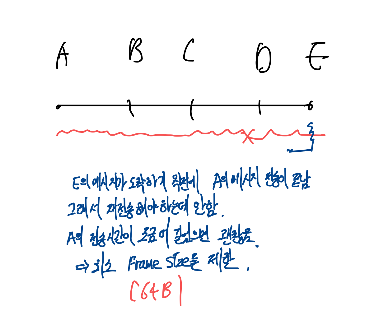 - CSMA/CD방식을 사용하는데, 해당 방식은 ACKs같은 것이 없기 떄문에 최소 Frame Size를 제한한다.
