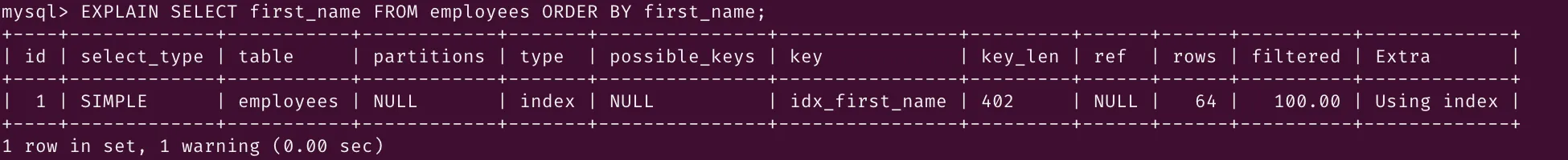 아래 쿼리에서 first_name에 대해서만 적용되어 있는 인덱스(idx_first_name)에 대해서 type = index (인덱스 풀 스캔) 그리고 Extra = Using index (커버링 인덱스) 가 적용 되었음을 확인할 수 있다.