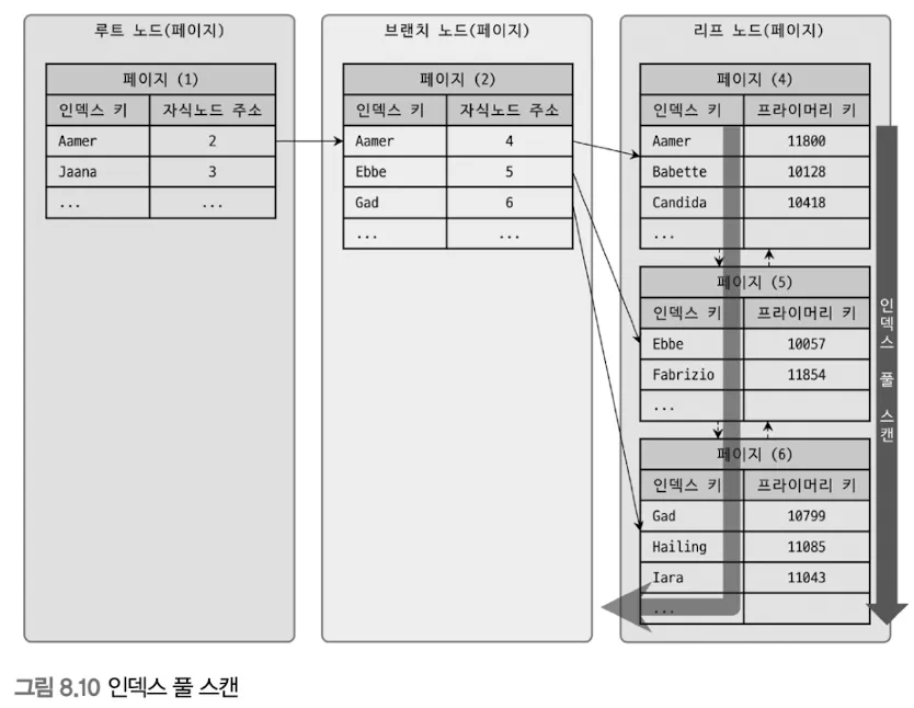 위와 같이 인덱스의 처음 혹은 끝에서 시작해서 끝 혹은 처음까지 쭉 스캔하는 방식이다.