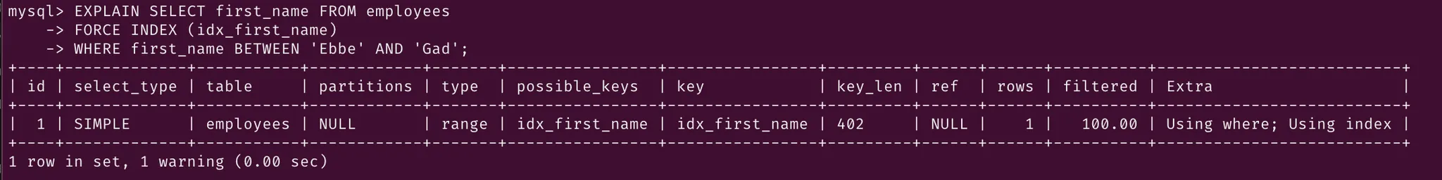 SELECT * FROM employees FORCE INDEX(idx_name_asc) ORDER BY name ASC LIMIT 1 OFFSET 1000000;