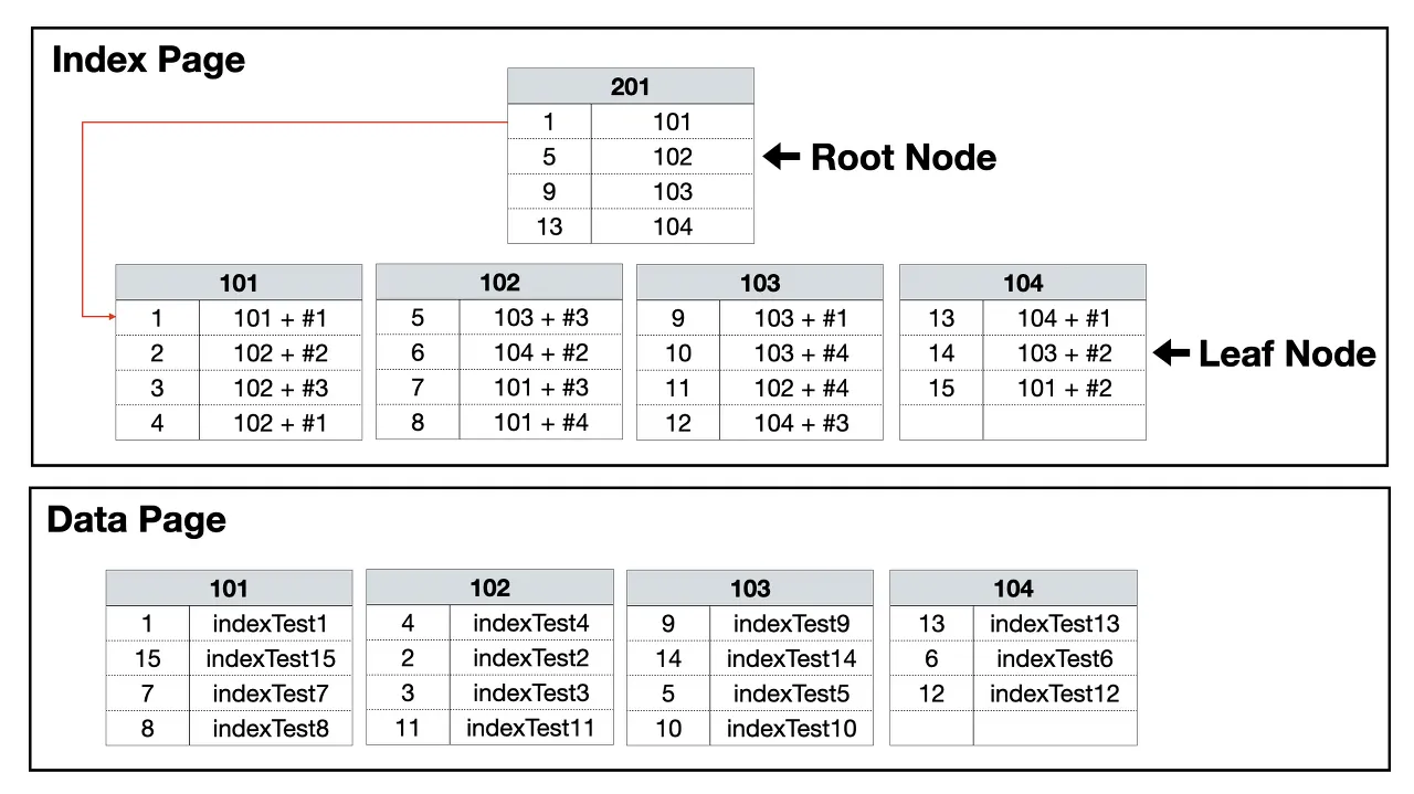 B-Tree 인덱스는 균형 트리 구조를 가지며, 루트 노드, 내부 노드, 리프 노드로 구성된다. 이때, 모든 리프 노드는 항상 같은 깊이에 위치하여 검색 성능이 일정하게 유지된다.