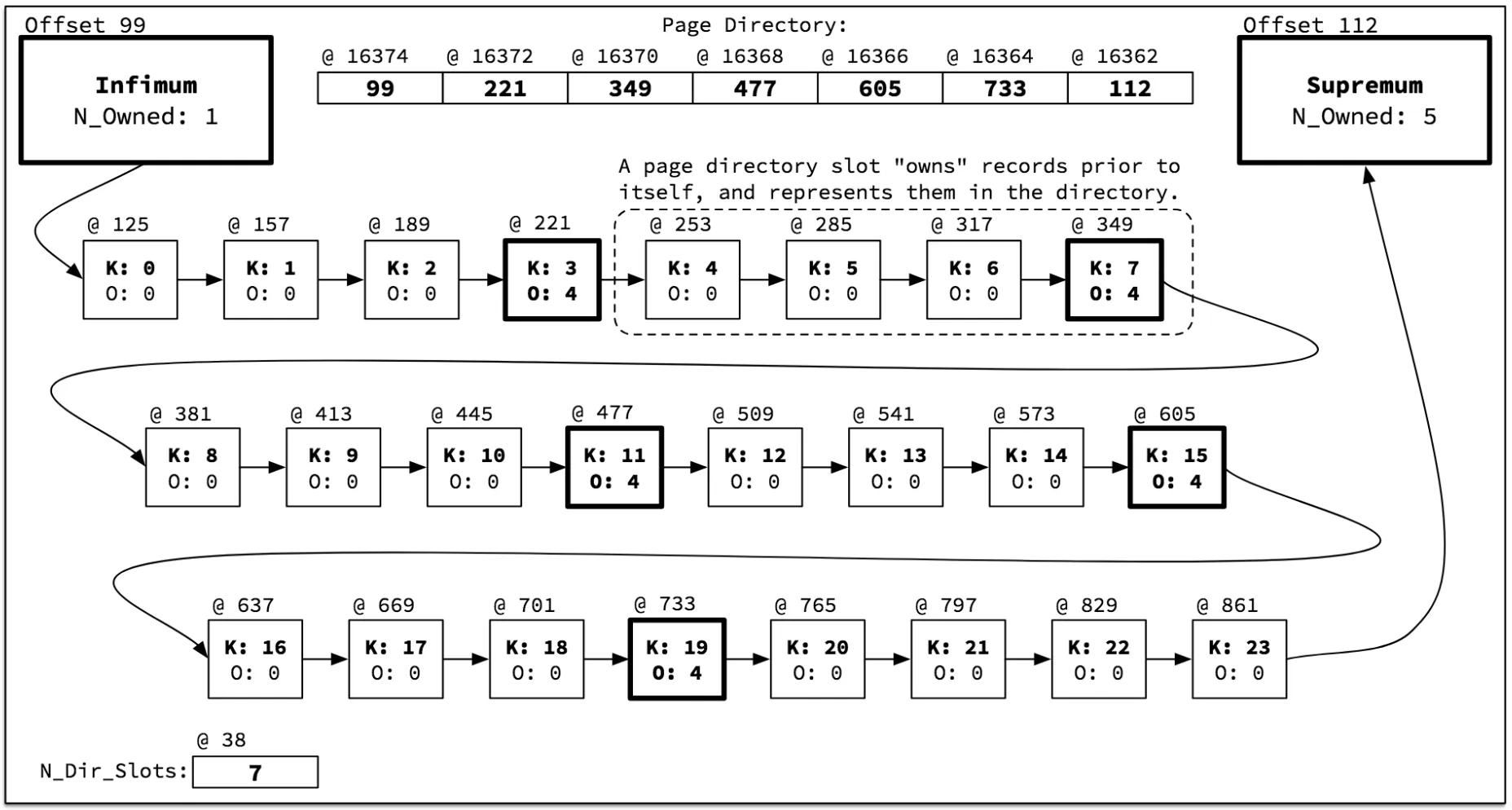 Double linked list로 연결된 B-Tree의 리프 페이지 구조와는 달리, 페이지 내부의 레코드들은 Single linked list 구조로 구성되어 있다. 즉, 페이지를 찾아가는 것은 방향에 덜 구애받지만 찾은 페이지 내에서 레코드를 찾는 것은 다른 얘기인 것이다.
