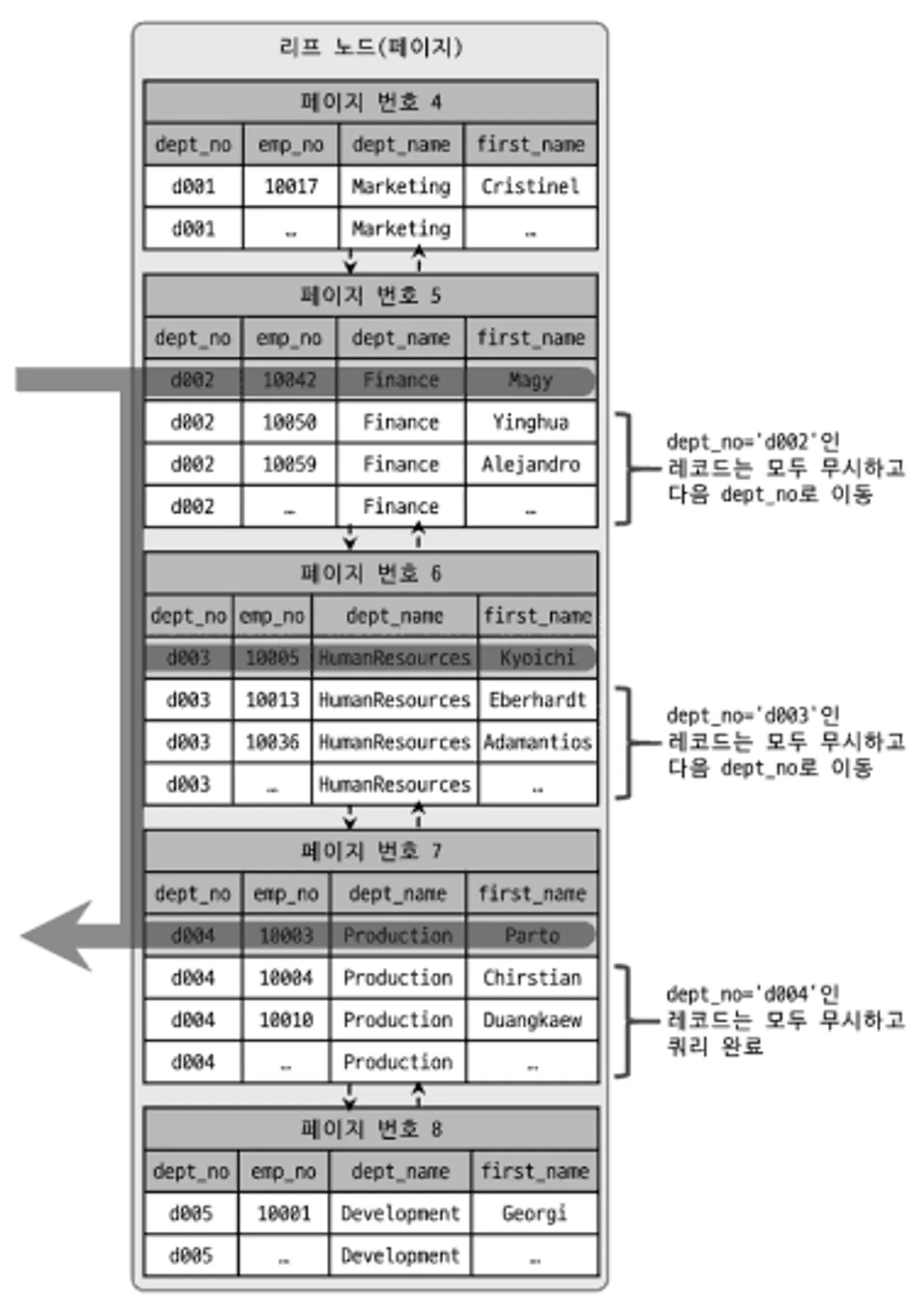 첫 번째 케이스에 대해서는 dept_no='d002' AND emp_no >= 10114 조건의 레코드를 찾고 dept_no=’d002’ 가 아닌곳까지 쭉 인덱스를 읽으면 된다. 어차피 dept_no='d002'라는 조건을 만족해야 조건에 맞는 레코드를 찾을 수 있는데 이미 첫번째 인덱스는 dept_no로 정렬되어 있기 때문이다.