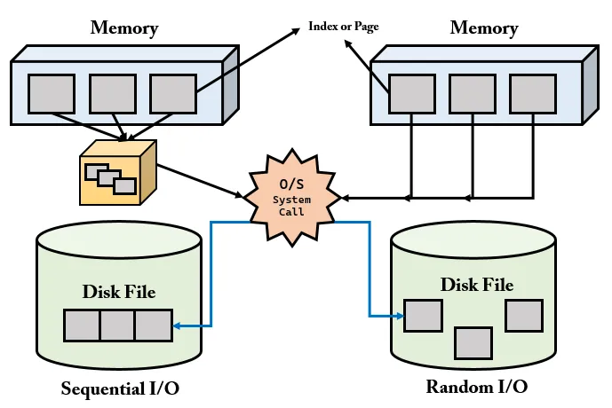 위 사진을 보면, 3개의 페이지를 기록하기 위해서 랜덤 I/O는 세 번의 System Call을 요청하고, 순차 I/O는 한번의 System Call을 요청했다. 만약 저장장치가 디스크라고 한다면, 순차 I/O는 디스크를 한 번 움직인 것이고 랜덤 I/O는 세 번 움직인 것이다.