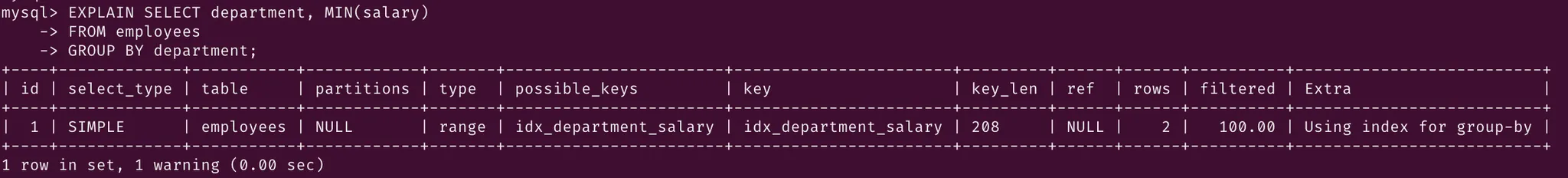 아래 쿼리 예제를 통해 idx_department_salary 인덱스에 대해서 type = range (인덱스 레인지 스캔) 그리고 Extra = Using index for group-by (루스 인덱스 스캔) 가 적용 되었음을 확인할 수 있다.