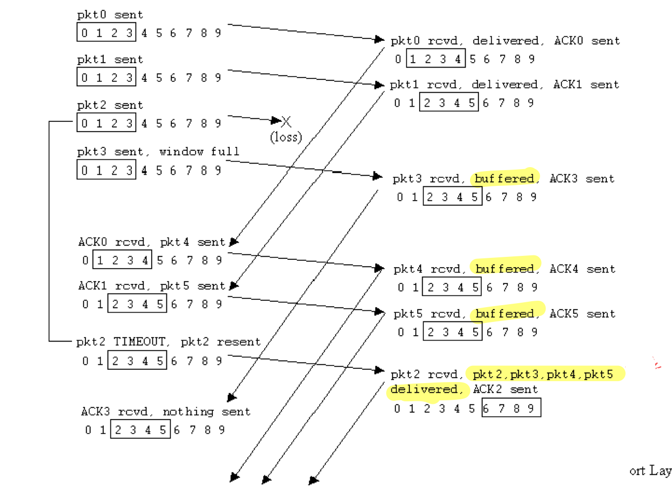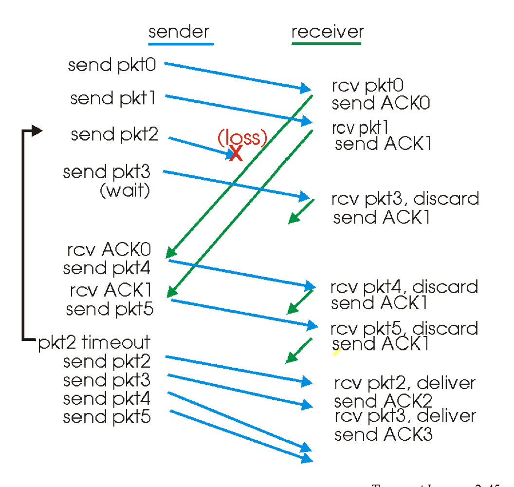 - 송신자는 ACK를 받지 않았고, 0번 패킷이 timeout이 되었으므로 재전송한다.