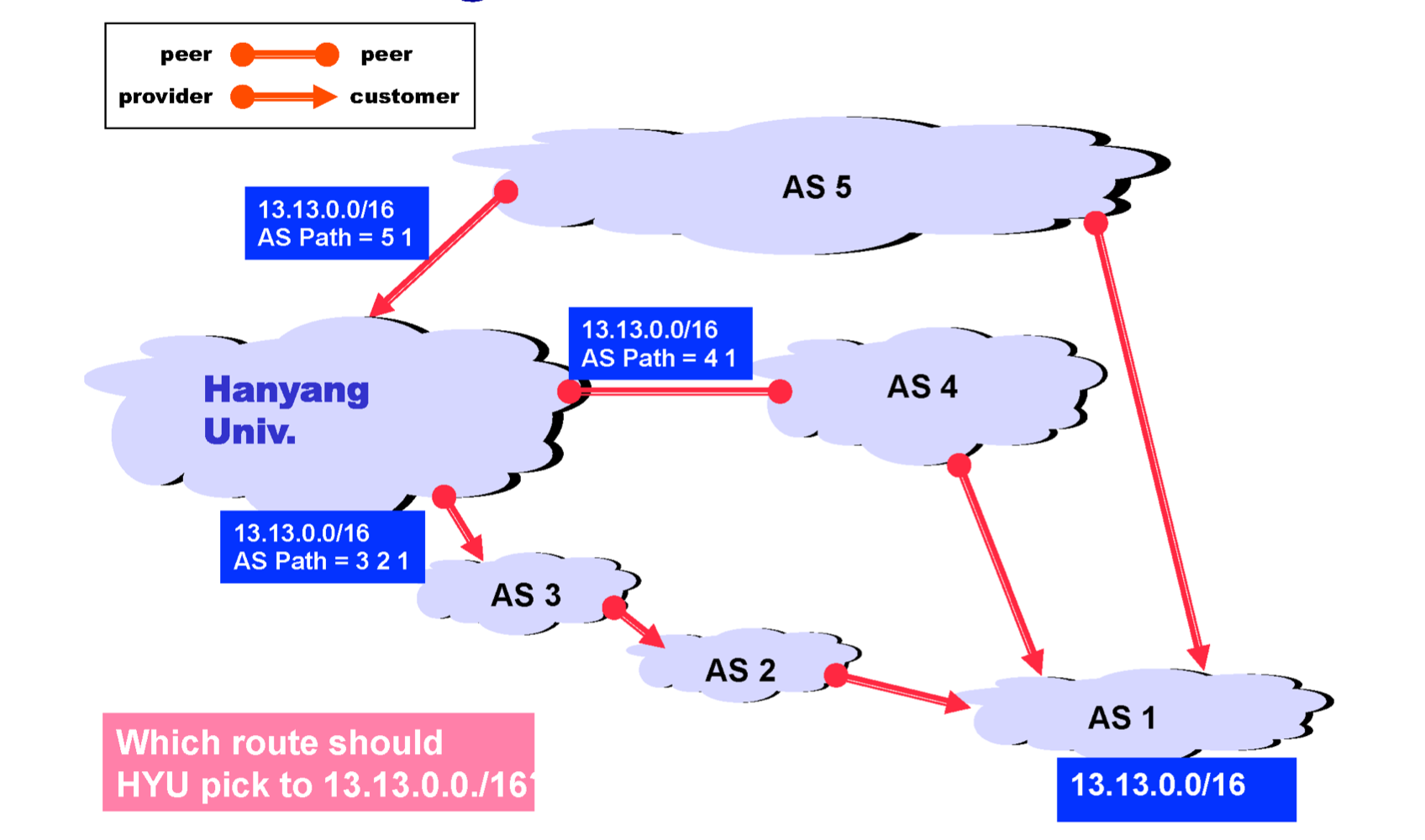 그래서 어떠한 트래픽이 전달되는 많은 경로가 있지만, 우선순위는 내가 가장 손해를 덜 보는 길로 선택하게 된다. 아래의 예시로 AS1에 가려고 한다면, 3개의 AS를 거치더라고 Provider를 더 많이 거치는 경로를 선택.