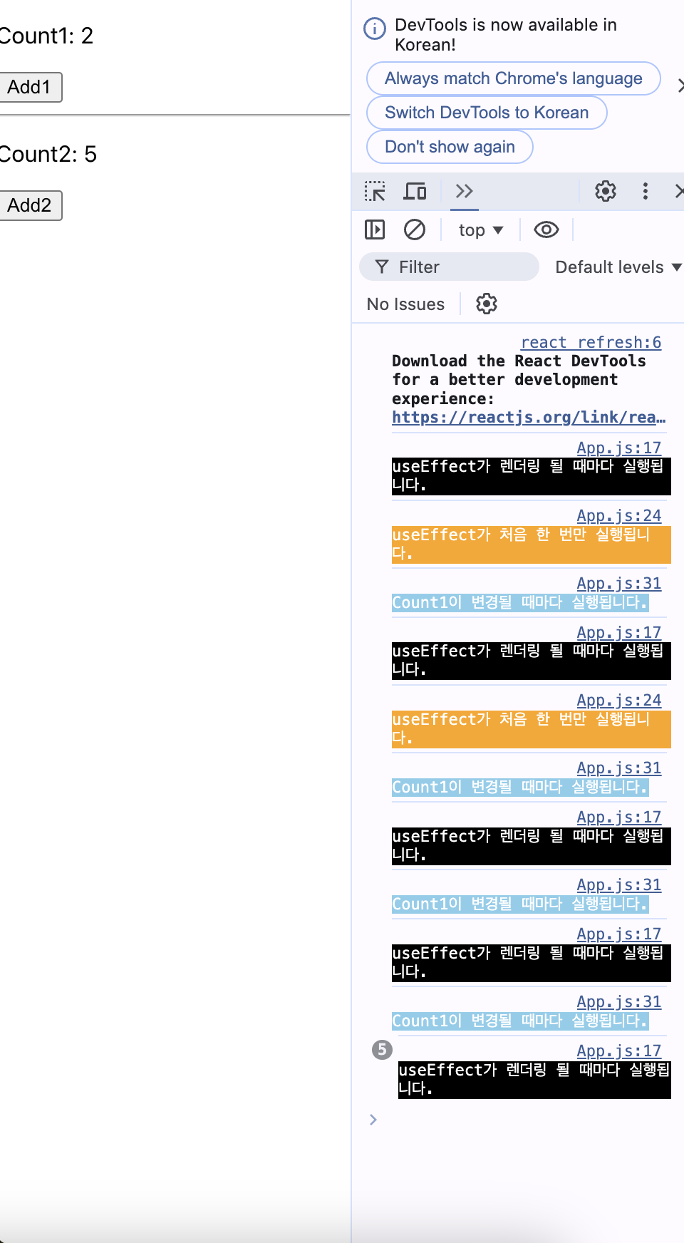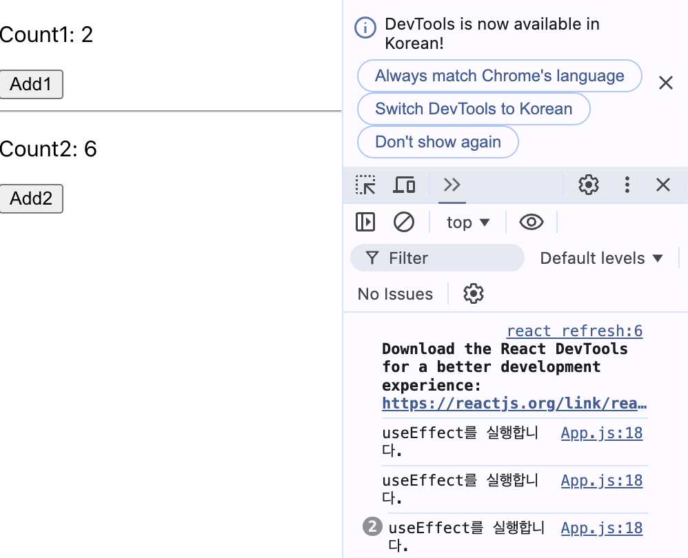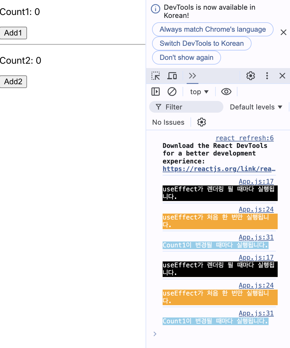 useEffect가 최초로 1회 실행이 되고, Count1을 업데이트 하면 useEffect가 실행되지만, 배열 안에 Count2를 변화시키는 변수를 넣지 않았기 때문에 Count2를 ADD해도 useEffect가 변화하지 않는다.