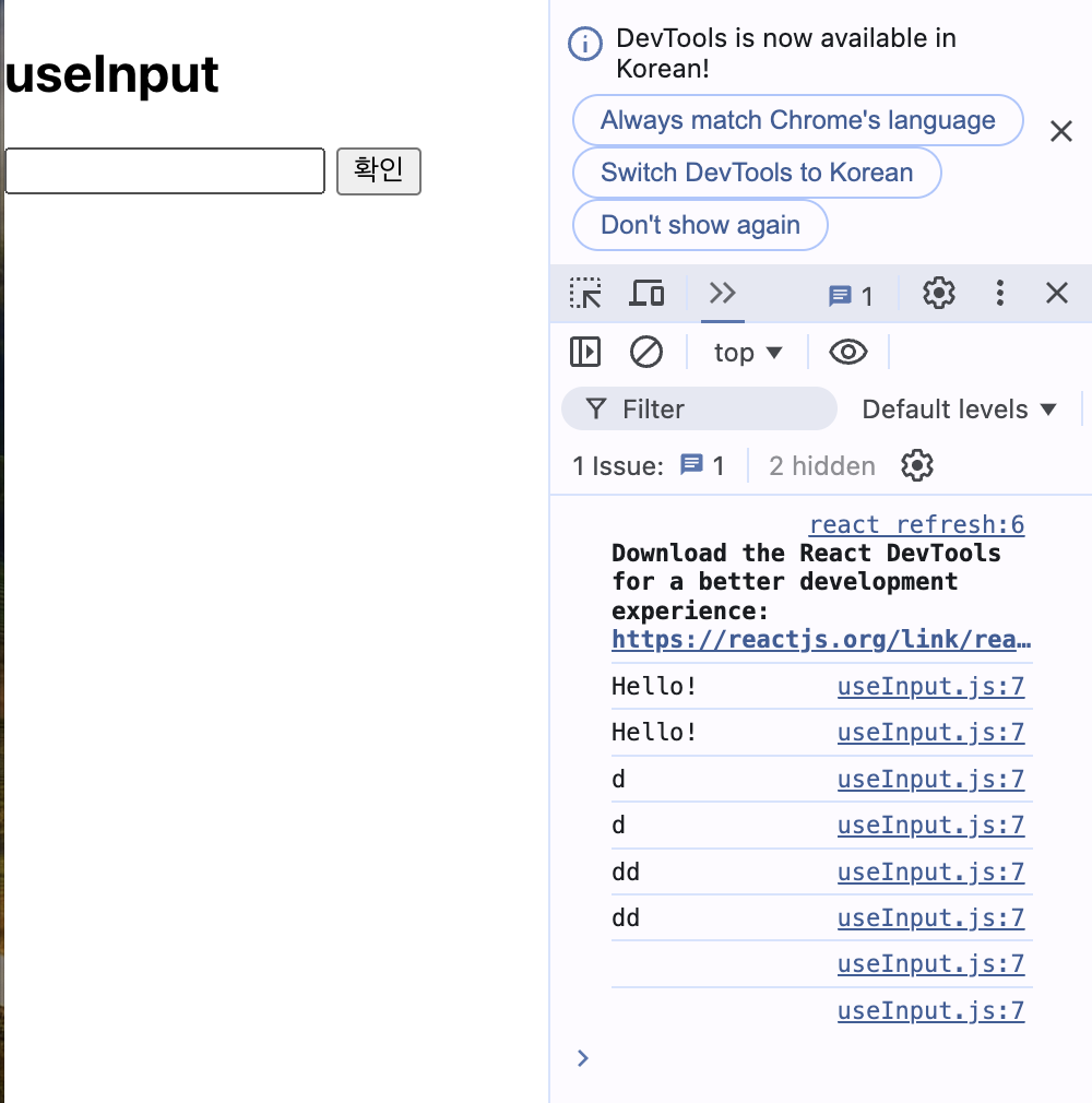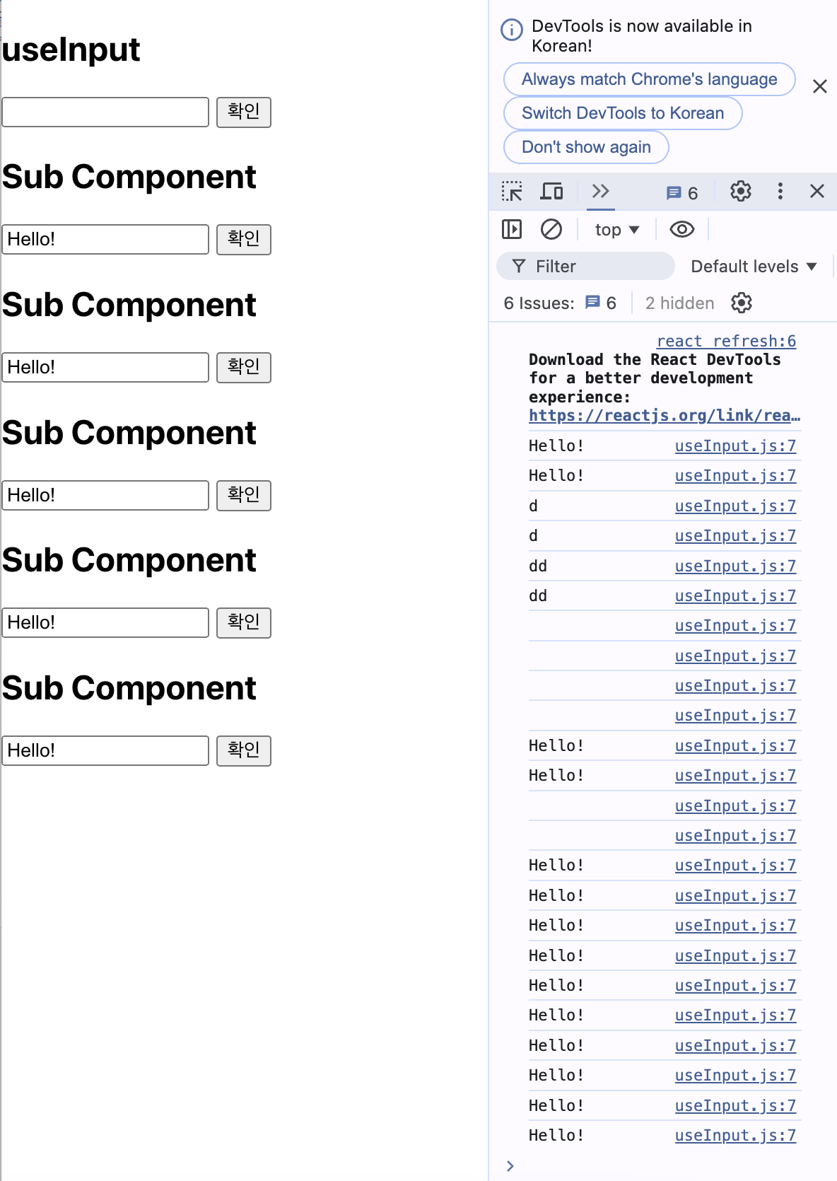 이때 집중해야할 점은 useInput은 컴포넌트가 아닌 hook의 역할로 사용되고 있는 것이고 Sub는 컴포넌트로 사용하고 있다는 점이다.