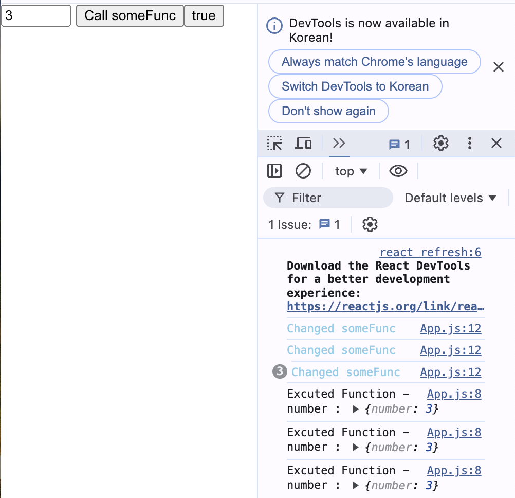 함수는 메모리에 저장되어 있기 때문에 함수를 실행할 순 있어도 함수라는 것 자체가 다른 값으로 바뀐 것이 아니. 따라서 useCallback을 이용해 함수 또한 memorize 한다면 useEffect를 사용해도 화면의 변화가 없는 것이다.