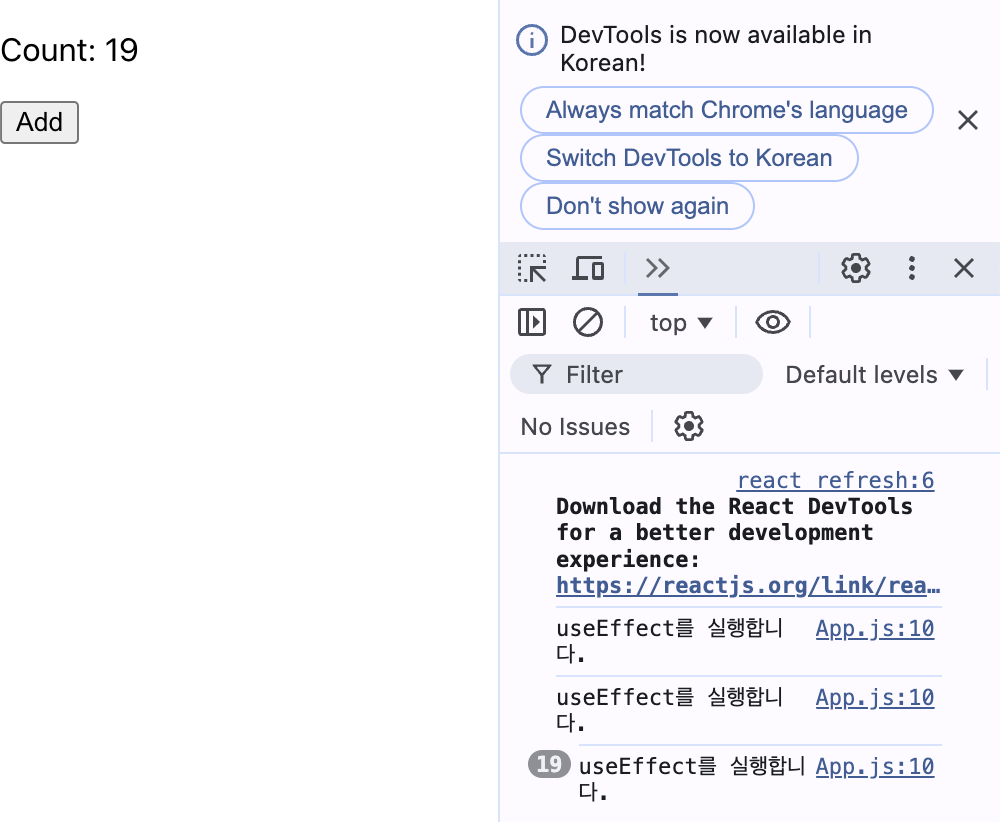 useEffect도 정상적으로 보이는 것 처럼 느껴지지만, console을 확인해보면 count가 계속 올라가는 모습을 볼 수 있다.