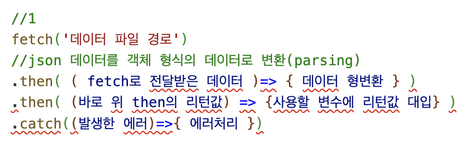 .then( ( fetch로 전달받은 데이터 )=> { 데이터 형변환 } )