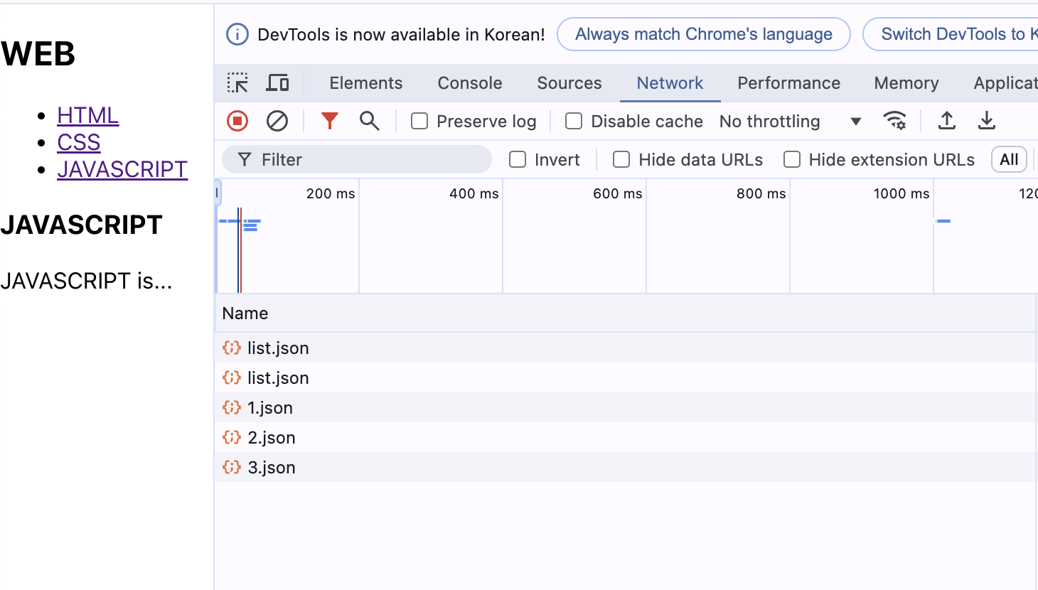 링크를 클릭하면 NetWork에 json 파일 Name이 출력되면 json 파일이 잘 불러와지고 있음을 알 수 있다!