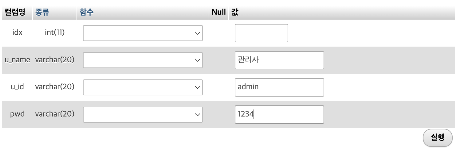 삽입에 들어가서 null 값을 입력하여 seed data를 3개정도 만들어준다.