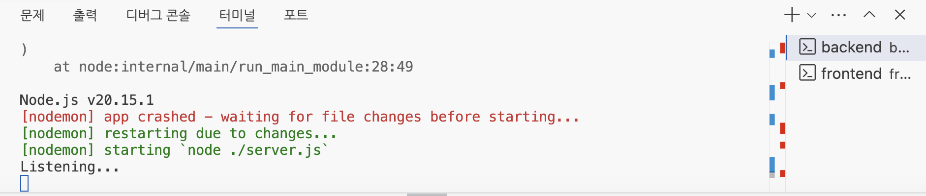 터미널을 2개로 나누어 프론트와 백엔드 터미널을 따로 사용하도록 했다!