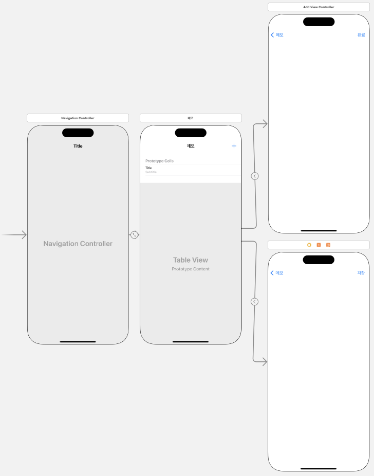 메인화면에서 +버튼을 눌렀을 때 새로운 view controller인 AddViewController에 연결해 메모를 작성하고 완료버튼을 누르면 메모를 저장할 수 있도록하였다.